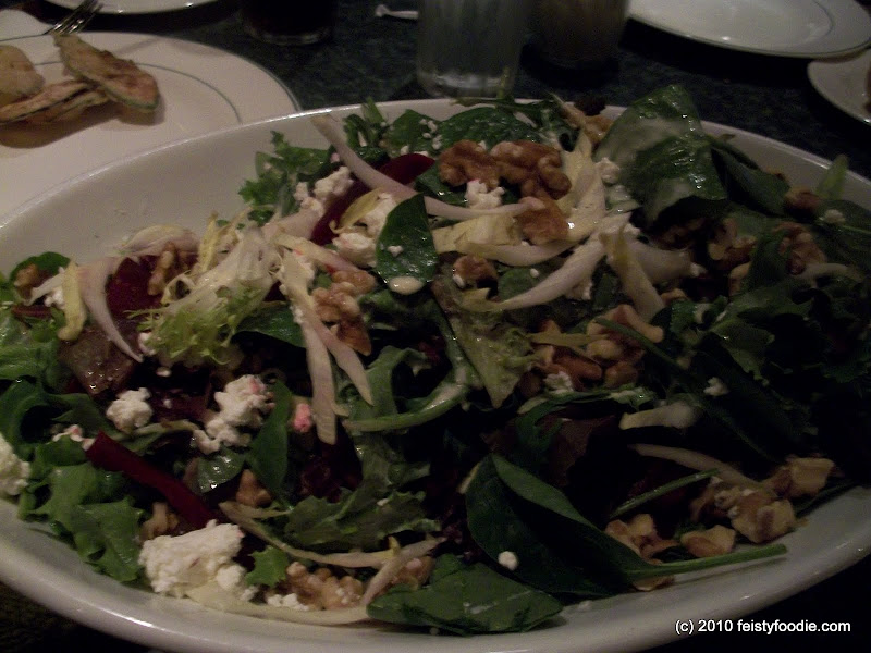 Although, we already got our serving of vegetables above, hehe, we also ordered a salad. We chose a family sized Organic Baby Greens with goat cheese, walnuts, beets, and a white wine balsamic vinaigrette. This salad was HUGE! It was more than enough for five people. It was definitely worth it at about $21 considering the size. It was dressed nicely, which most restaurants seem to have problems with.