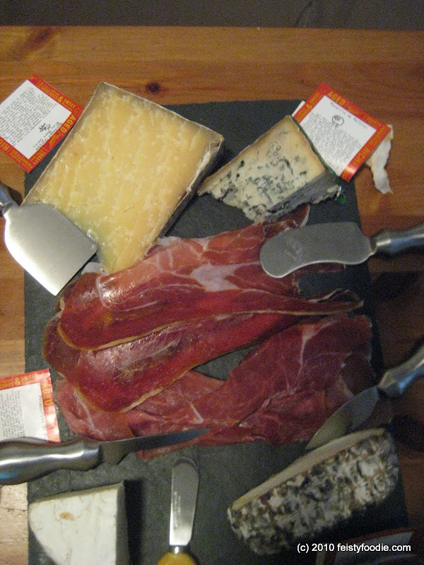 We started off with seven different cheeses from Murray’s. I didn’t write down the names of all of them, but can tell you there was an aged cheddar, gouda, black truffle goat cheese, and my favorite, a smoked brie. There was also some Prosciutto di Parma.