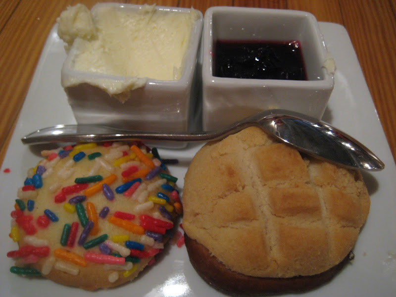 CT says: I don’t think TT actually ate any of the cookies. I, on the other hand, had no problem starting my meal with dessert. In fact, this made me extremely happy, though wishing I’d ordered a coffee to pair with them. Except for the sprinkles (love!), the cookies were not very sweet, but rather very buttery. I felt funny, and gluttonous, putting more butter on my butter cookies, but I tried a bit anyway. It was definitely not necessary. The jam was good on the non-sprinkled cookie. It was somewhere between a cookie and a biscuit (and I mean a Pillsbury-type flaky biscuit, not an English biscuit). The sprinkle cookie was perfect all on its own. I ate half pre-brunch and half for dessert.
