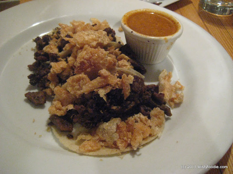 Tacos Campechanos($10)- finely chopped cecina(salt cured steak), chorizo, house made chicharrón, served with warm chile de arbol and chicharrón salsa. The first thing I noticed was that these taco were quite small(fist sized) and only had one layer of corn tortilla. Fortunately, there was plenty of steak and chicharrón packed on top. I am glad the chef didn’t bother with putting anything else beside beef, sausage and fried pork skin in the taco. Vegetables just get in the way. Am I right or am I right? The tacos were pretty amazing. Chewy salty meat and crunchy pork was a great consistency combination. The accompanying salsa was packed full of chiles and was much hotter than the salsa rojo. The tacos were so flavorful that I barely used the salsa.