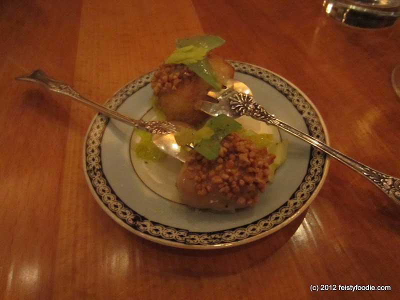 Smoked Sable Cigarette- It consisted of gnocco fritto, sable, cod roe, and poppy seed “ashes” served in an ashtray. When I first heard about this course when the menu was announced I was a little apprehensive since no one eats cigarettes. Remember the massive fail of the edible “cigar” Chris made on Top Chef last season? I am not really a fan of cream cheese but it was a small cigarette, so it was ok. The crunchy fried dough with the creamy cheese and just a hint of salty fishiness from the sable and roe was delicious.