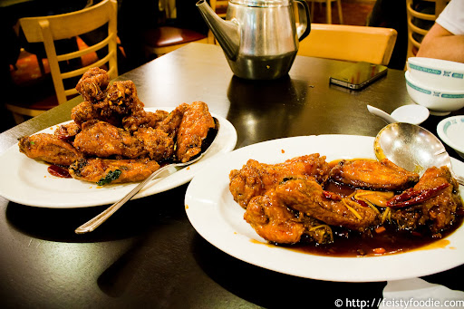 Both platters together – I don’t care for the wet fried chicken. It smells slightly funky to me; like one of those wet rags that many Chinese restaurants use to wipe down their tables after each turn… funky. It’s pretty faint while you’re eating it at the restaurant, but I did notice it both times I ate them. They’re crisp, savory, but I just don’t care for that slight funk.