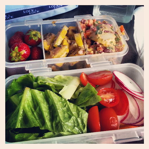 Local strawberries; summer squash; dressed potatoes; salad