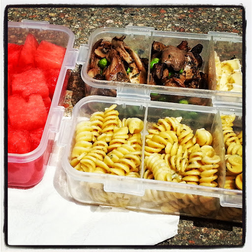 Roasted mushrooms with fresh peas; triple crème brie; rotini tossed with tonnato; watermelon