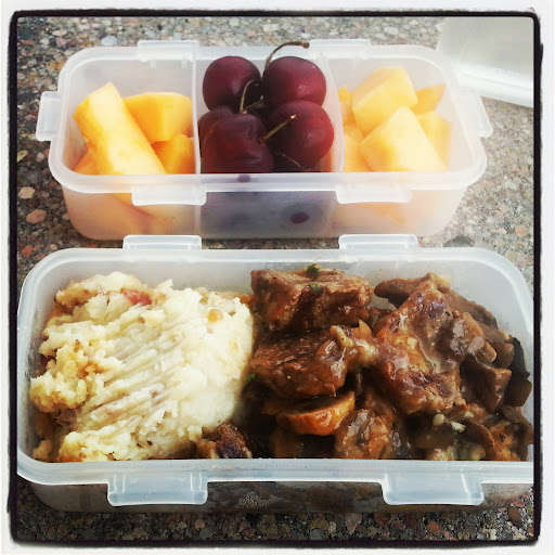Cantaloupe, cherries in the divided box; mashed potatoes and steak tips with gravy in the other one. Those are leftovers from somewhere I can’t tell you I ate.
