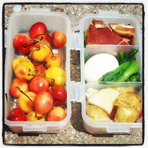 Golden rainier cherries – my favorite; crispy pork belly, soft boiled egg, greens and boiled potatoes.