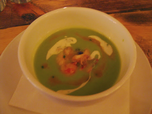 Our first course: English pea soup with poached lobster, ramps, horseradish crème; obviously this was super long ago because it had ramps. Obviously this would not be on the menu now, as it’s a spring dish, but it was very tasty.