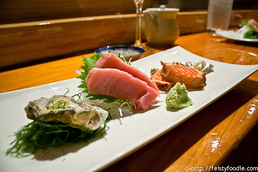 First up, our sashimi plate, from left to right: fresh Kumamoto oyster topped with citrus; fatty tuna; King salmon marinated overnight in soy and sake; herring with miso sauce. The oyster, super fresh on its own, elevated by the citrus; fatty tuna, giving way in my mouth to the delightful creaminess of its flesh; the flakiness of the King salmon, accented by the savoriness imparted by marinating in soy sauce and sake; and finally, the tiny oily fish with the rich miso sauce working well as closing bites.