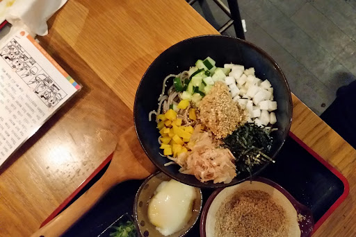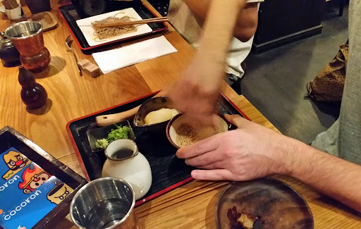 Jared, the adventurous one, ordered natto soba. This required some work on his part – grinding sesames into a fine meal to sprinkle atop his bowl of soba. I tried the natto. I didn’t die. If you don’t know what it is and have a weak stomach, don’t look it up. I didn’t think it was anything amazing nor gross (well, I knew what it was before I tried it, and had thought the description gross, but once I ate it, the taste wasn’t gross). I actually thought it’d taste more like huitlacoche, which I found harder to wrap my head around as a concept, but truly delicious (it tastes like super earthy mushrooms). But natto was… eh. Just sticky. Anyway, back to the soba: his set looked pretty interesting, with lots of things to toss together and mix as you please, which, as this wasn’t his first time, he knew exactly what to do and what he liked.